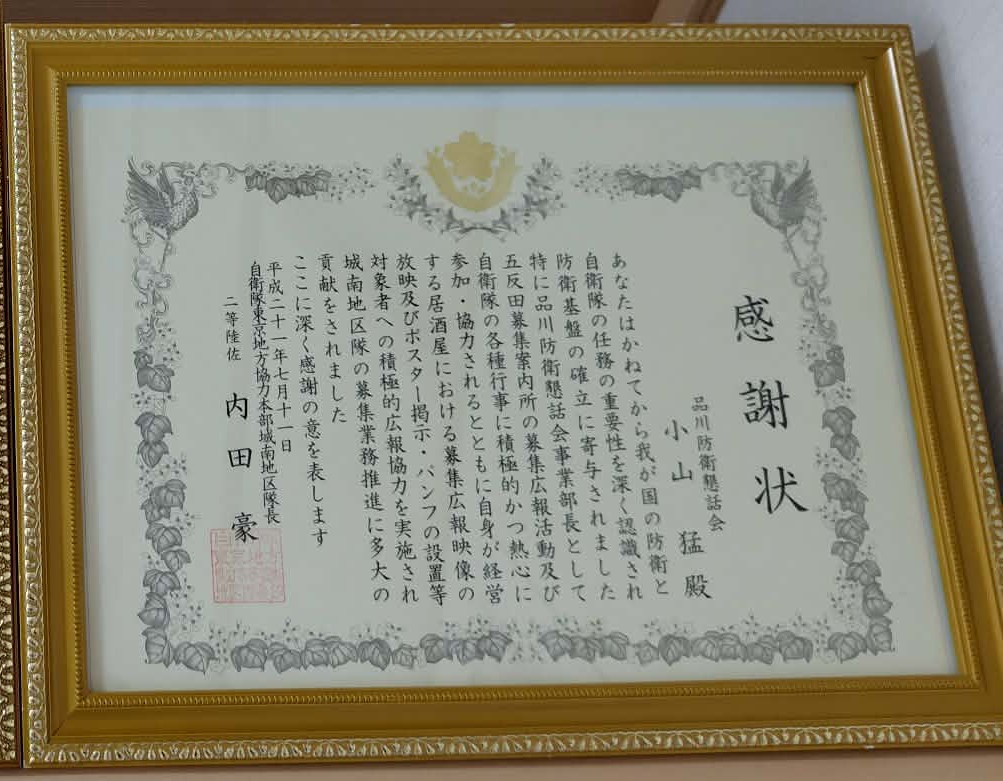 当会事業部長の小山猛氏が城南地区隊長から感謝状を授与されました。
